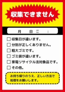 正しく分別されてないゴミは、回収されずに集積所に残されます。警告シールを貼られるだけでなく、放置されれば悪臭や近隣トラブルの原因にもなります。