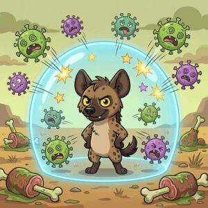 サバンナの過酷な環境を生き抜くため、他の動物が食べ残した硬い骨や蹄まで噛み砕くことができる強靭なアゴを持っています。