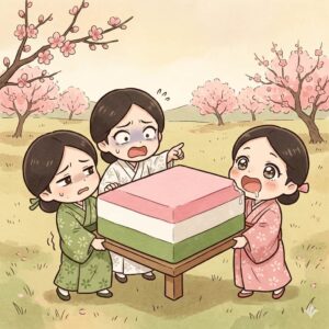 ひし餅は下から緑、白、ピンクの順に重なり、緑は大地、白は雪、ピンクは魔除けである桃の花をそれぞれ表しています。
