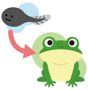オタマジャクシの時期は尾があり、肺がなくてエラで呼吸しています。成長とともに足が生え、尾が消え、肺呼吸へと変化するという「変態」を遂げます。