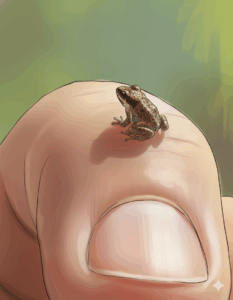 硬貨よりも小さい世界最小のカエルで、人間の爪の上にちょこんと乗るほど。鳴き声もとても高く、虫と聞き間違えるほどです。