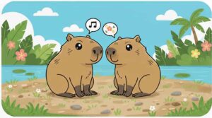 カピバラは感情に合わせて様々な鳴き声を使い分け、群れの仲間と密にコミュニケーションをとります。