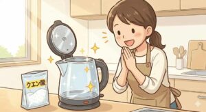 電気ポットやケトルの底にこびりつく白いガリガリした汚れは水道水に含まれるミネラル分ですが、酸性のクエン酸を入れて沸騰させるだけで簡単に溶かせます。