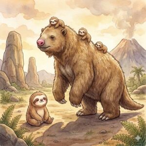 およそ1万年前までの大昔の地球には、メガテリウムと呼ばれる巨大なナマケモノの祖先が地上を歩いて生活していました。