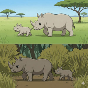 開けた草原に住むシロサイの子供は外敵を見つけるために母親の前を歩き、茂みに住むクロサイは母親の背中を追います。