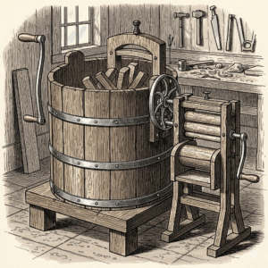 現代の洗濯機の原型は18世紀に登場しましたが、なんと木製で手動式。ドラムをハンドルで回して水をかけるだけの仕組みでした。