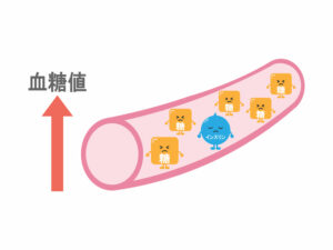 血糖値は食事で摂った糖が血液中にどれだけ存在するかを示す数値です。健康な人はインスリンが働き一定に保ちますが、糖尿病では調整がうまくいかず高い状態が続きます。