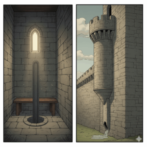中世の城には「ガードローブ」と呼ばれるトイレがあり、壁の外に突き出た小部屋から直接下へ排泄物を落とす仕組みでした。