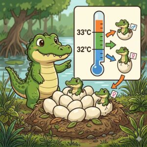 ワニには性別を決める性染色体が存在しておらず、卵が温められる巣の温度によってオスになるかメスになるかが自動的に決まる仕組みです。